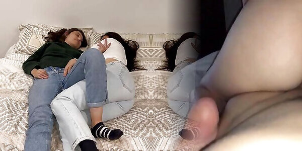 95:38une ado aux cheveux noirs aux petits seins qui chatouille les doigts sur le canapé